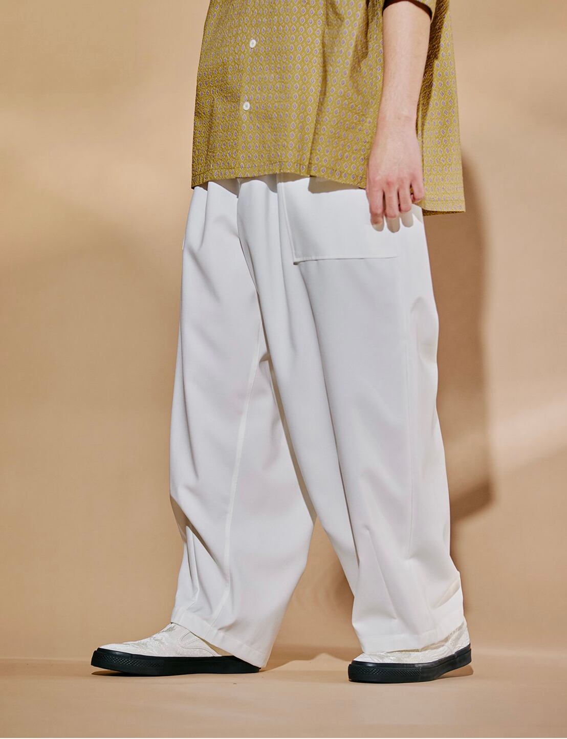 裾を狭め、膝のダーツで立体感とゆとりを加えたシルエットにベイカーポケットがついています。