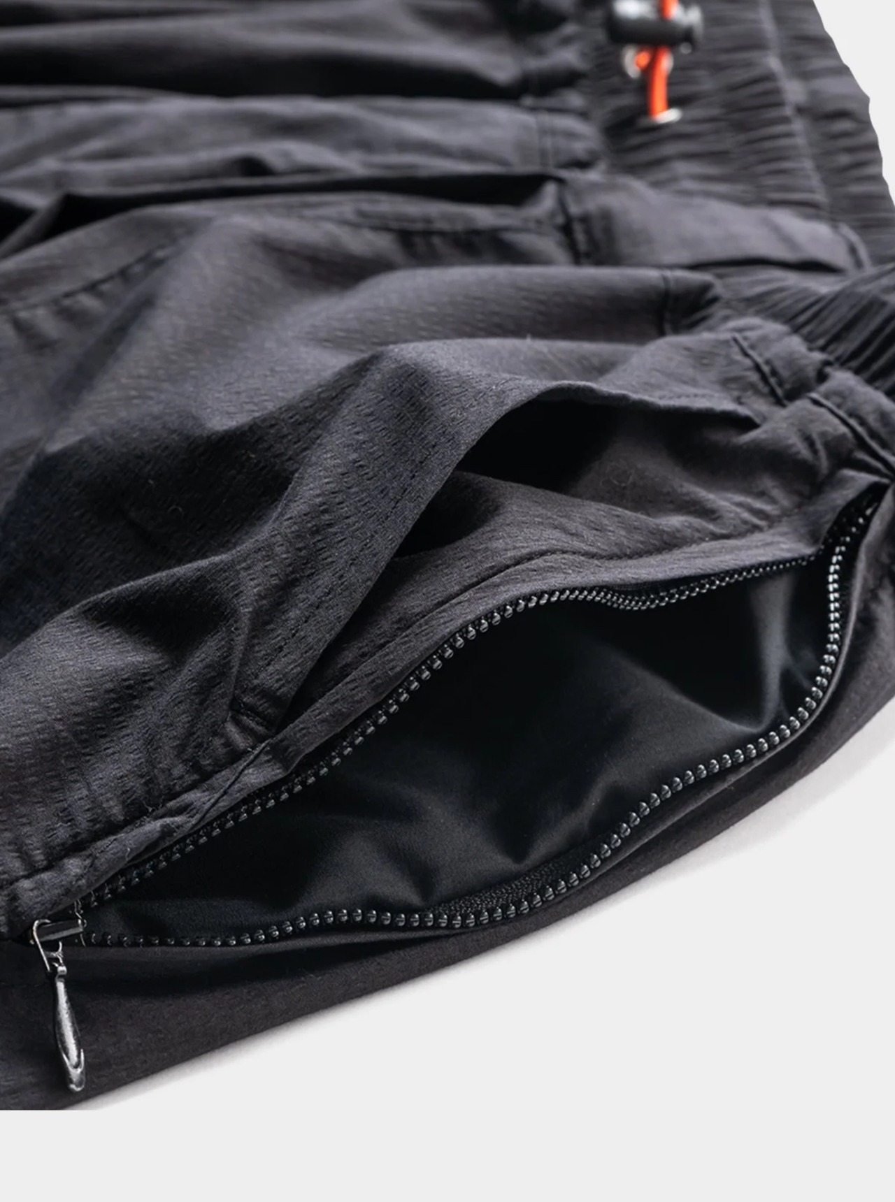ロゴプリント入りのベイカーポケットに加え、サイドシームに沿った便利なコンシールドファスナーポケットも搭載。