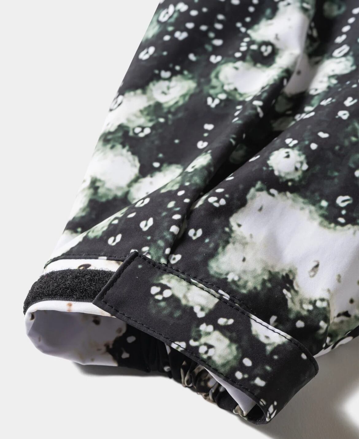 袖口と裾は共にゴムシャーリング仕様でベルクロ付きのアジャストフラップで調整可能。